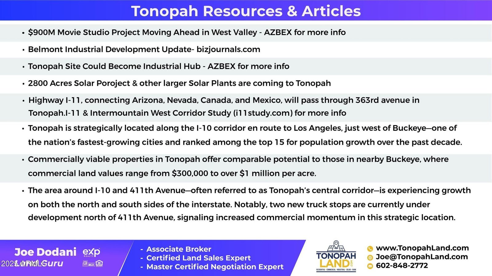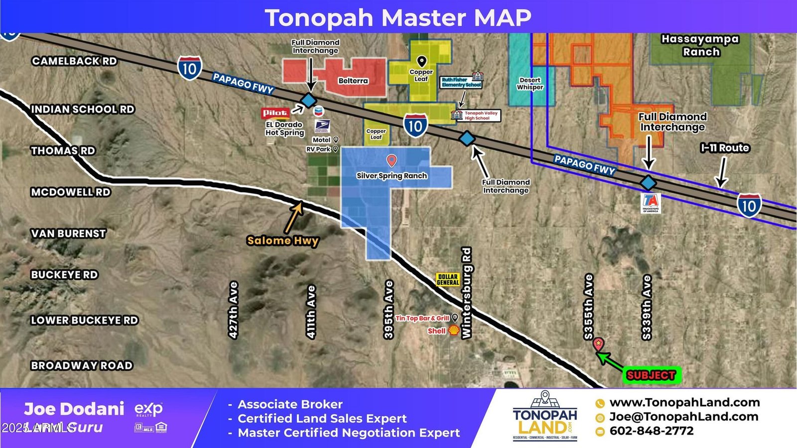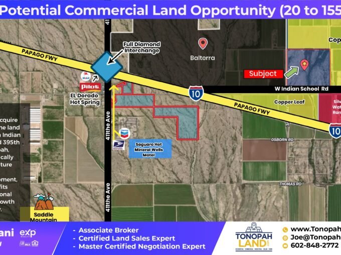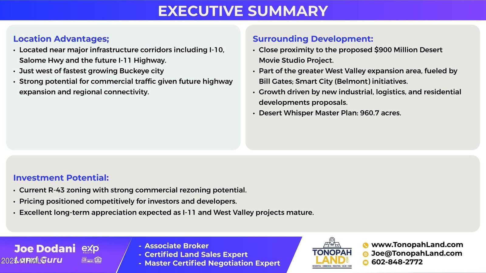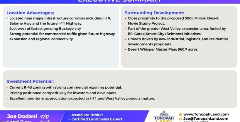 Location Advantages; Corner lot on paved Broadway and paved 355th ave. – potential commercial Located near major infrastructure corridors including 1-10. Salome Hwy and the future 1-11 Highway. Just west of fastest growing Buckeye city Strong potential for commercial traffic given future highway expansion and regional connectivity. Surrounding Development: Close proximity to the proposed $900 Million Desert Movie Studio Project. Part of the greater West Valley expansion area, fueled by Bill Gates; Smart City (Belmont) initiatives. Growth driven by new industrial, logistics, and residential developments proposals. Desert Whisper Master Plan: 960.7 acres. Investment Potential: