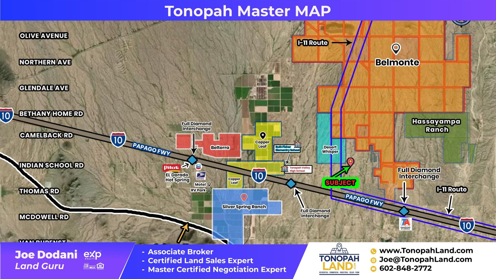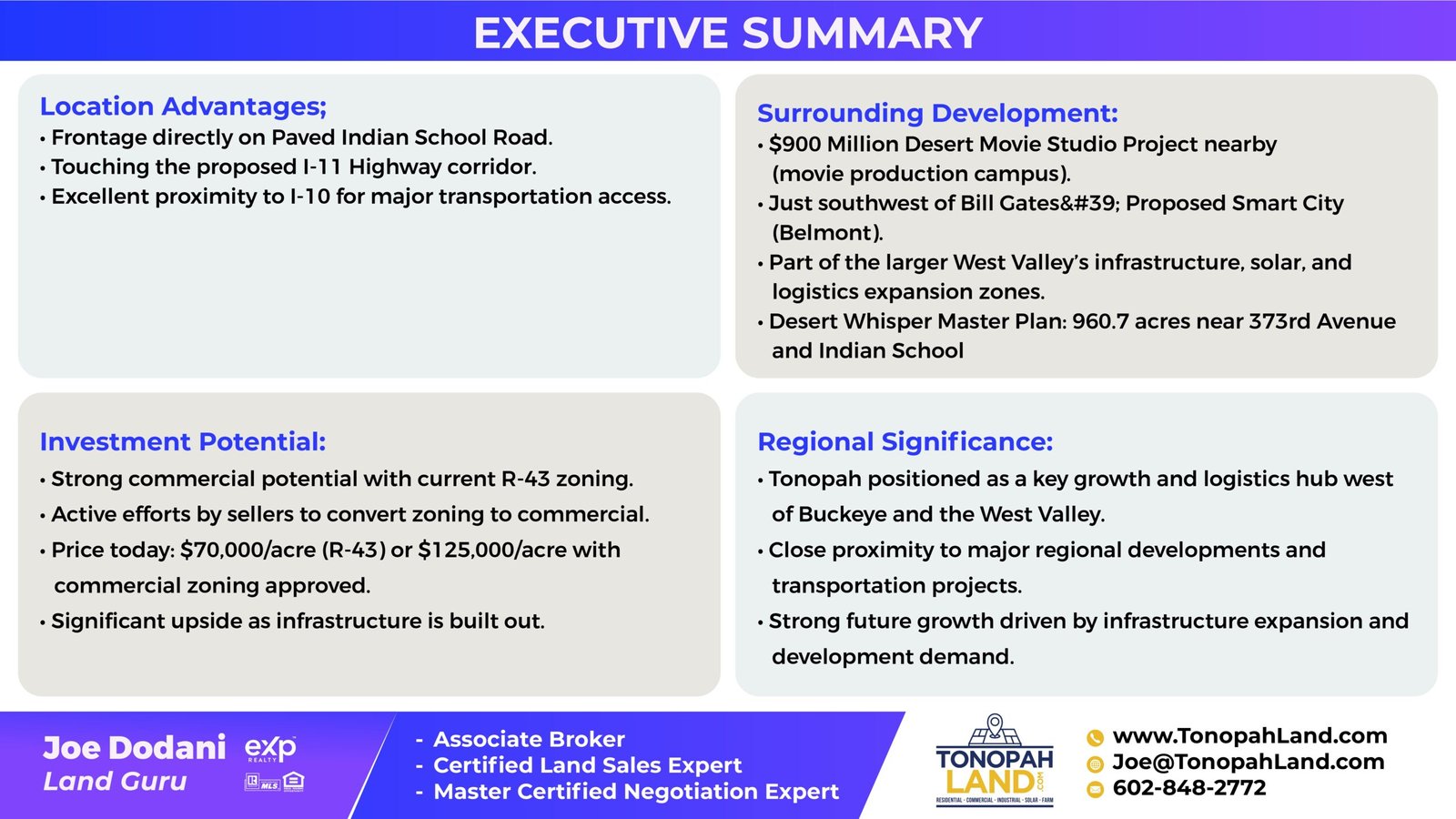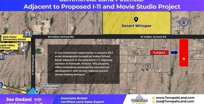 Strong commercial potential with current R-43 zoning. Active efforts by sellers to convert zoning to commercial. Price today: $70,000/acre (R-43) or $125,000/acre with commercial zoning approved. Frontage directly on Paved Indian School Road. Touching the proposed 1-11 Highway corridor. Excellent proximity to 1-10 for major transportation access. Surrounding Development: $900 Million Desert Movie Studio Project nearby (movie production campus). Just southwest of Bill Gates’ Proposed Smart City (Belmont). Part of the larger West Valley’s infrastructure, solar, and logistics expansion zones. Desert Whisper Master Plan: 960.7 acres near 373rd Avenue and Indian School Investment Potential: Strong commercial potential with current R-43 zoning.